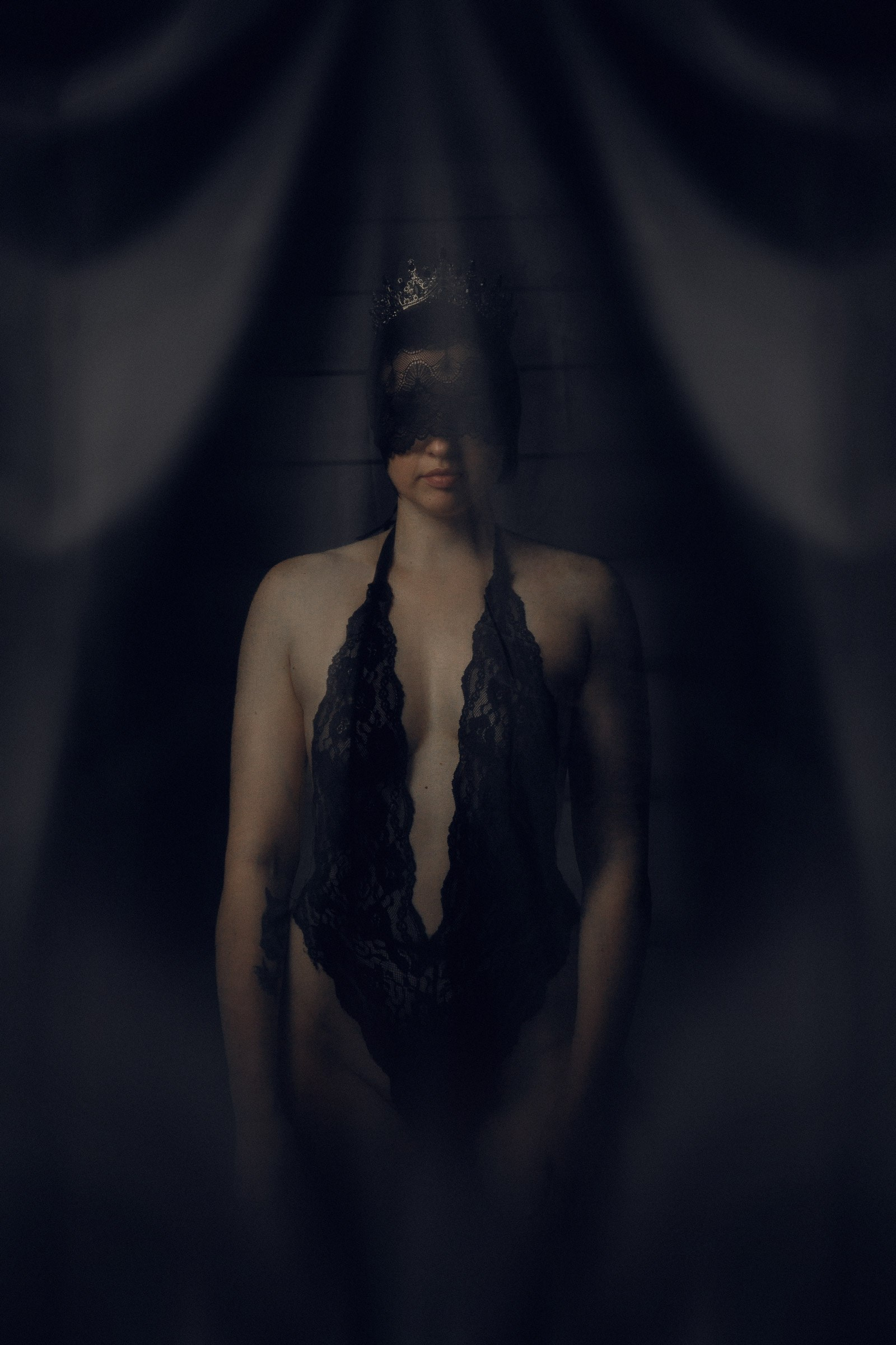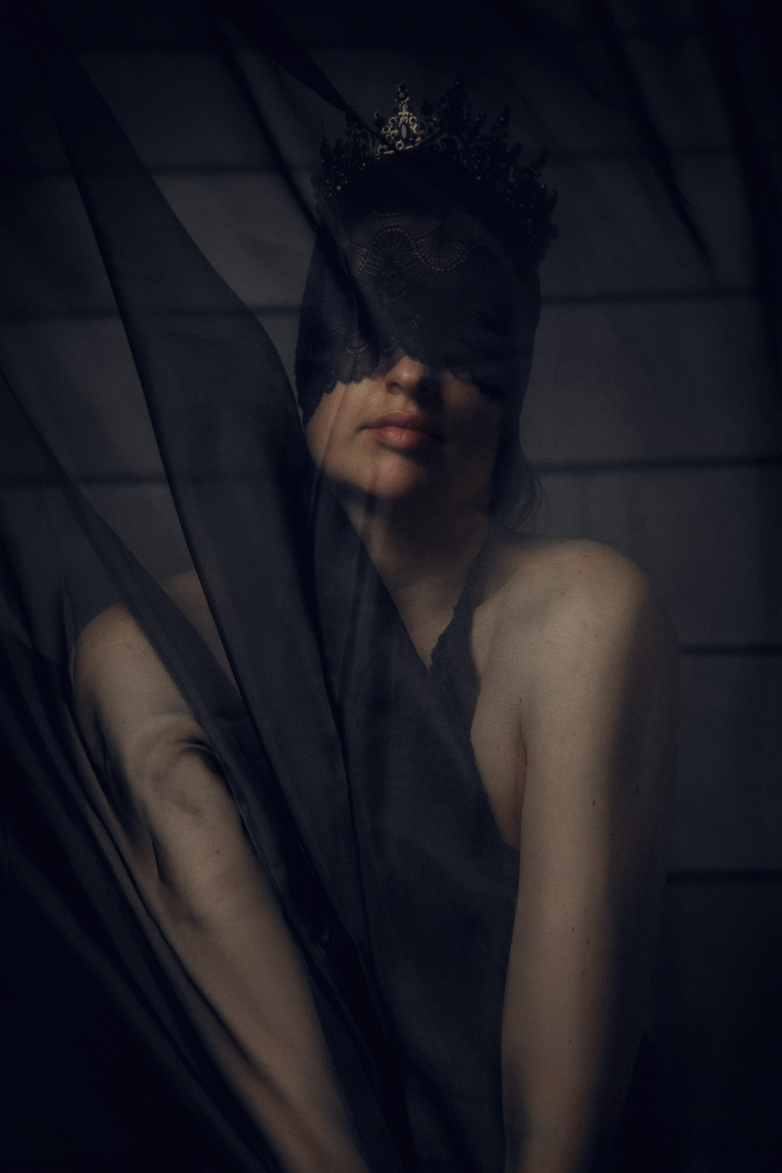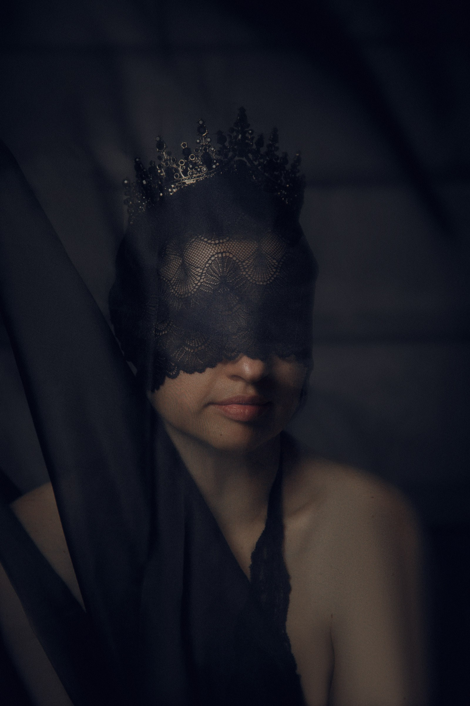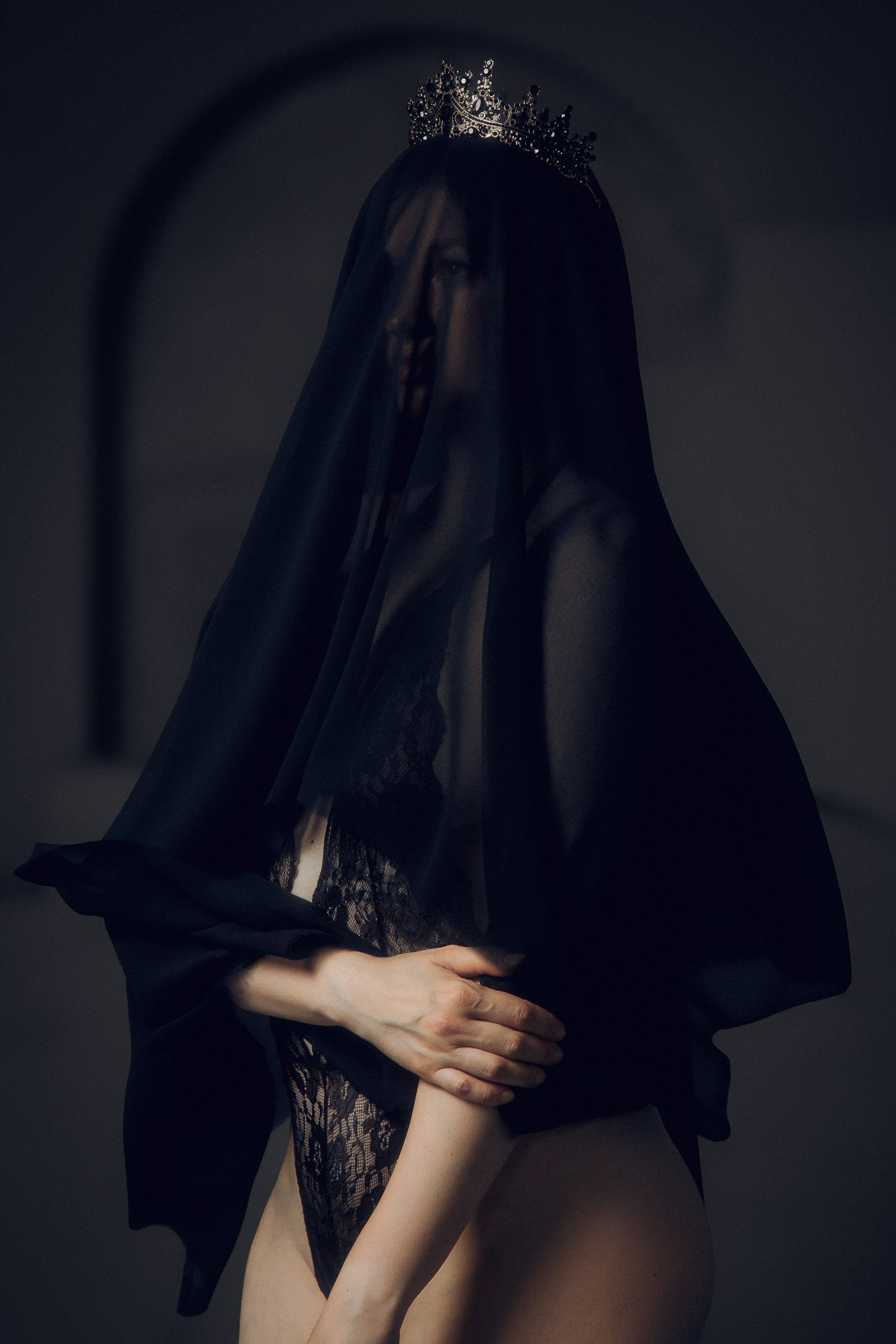 Фотосессия с черной вуалью и короной в студии для Дарьи