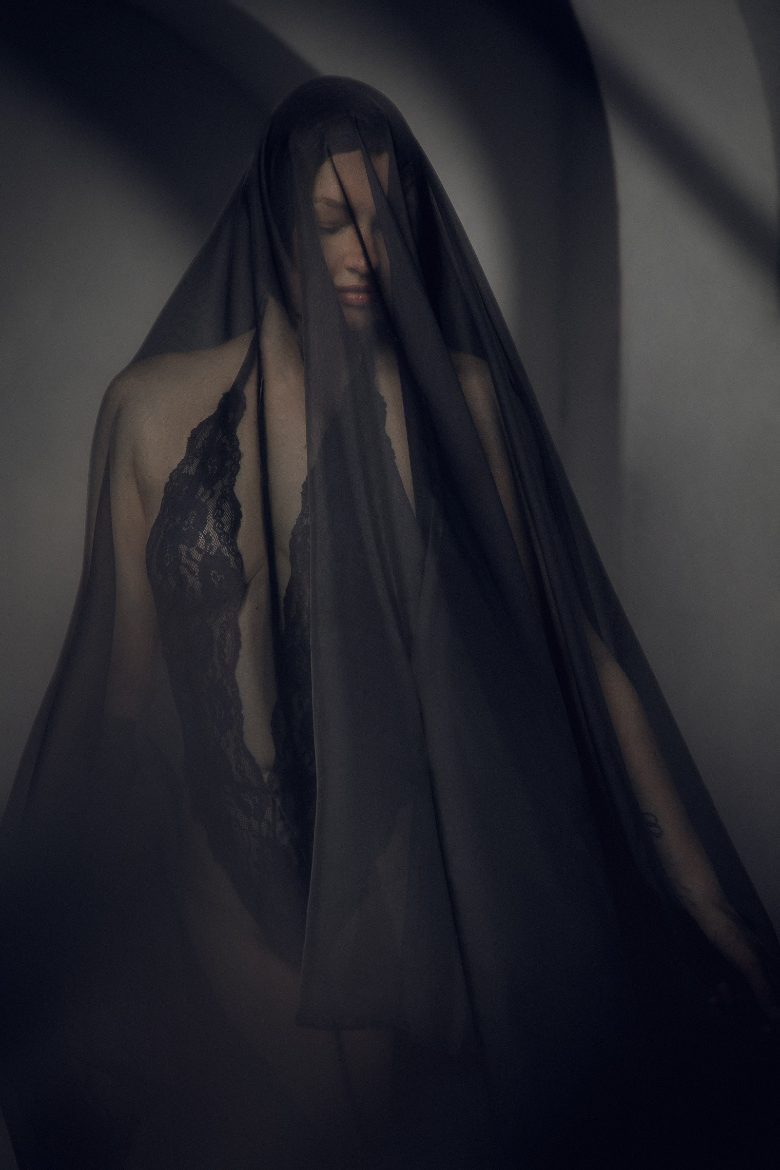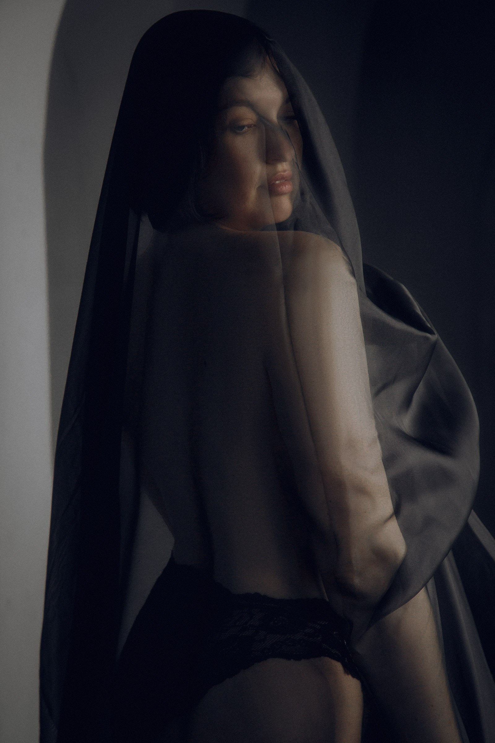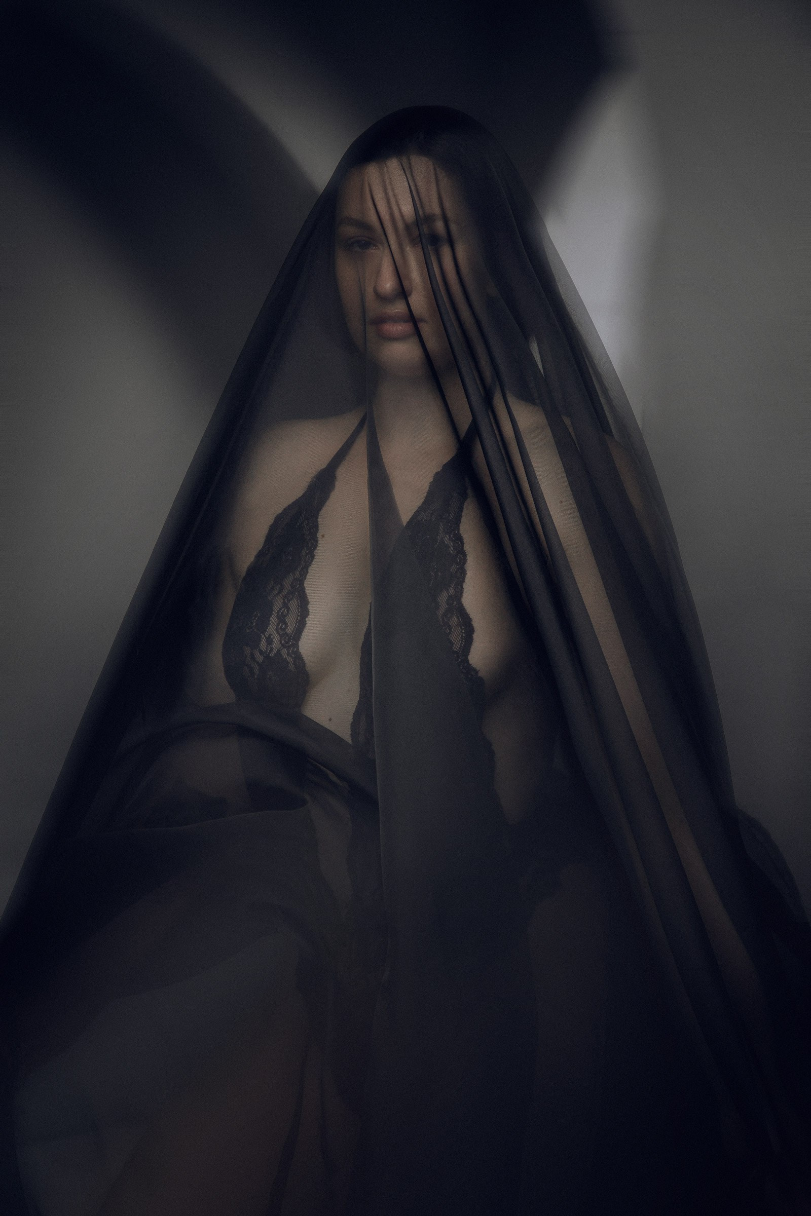 Фотосессия с черной вуалью и короной в студии для Дарьи